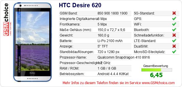Hast du eigene Webseite? Willst du die Informationen über Standarddaten des Handys HTC Desire 620 irgendwo veröffentlichen? Das ist sehr einfach. Du kannst das Bild herunterladen oder kopieren und auf der Webseite folgenden Code hinzufügen:Das Einfügen von diesem Code verursacht das Anzeigen von dem folgenden Bild: