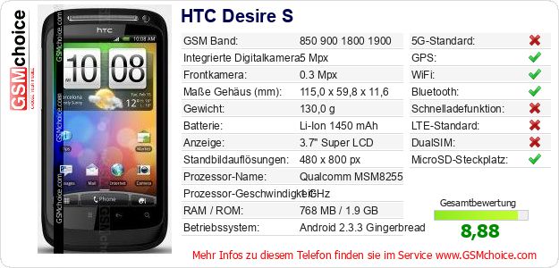 Hast du eigene Webseite? Willst du die Informationen über Standarddaten des Handys HTC Desire S irgendwo veröffentlichen? Das ist sehr einfach. Du kannst das Bild herunterladen oder kopieren und auf der Webseite folgenden Code hinzufügen:Das Einfügen von diesem Code verursacht das Anzeigen von dem folgenden Bild:
