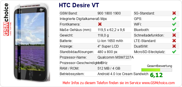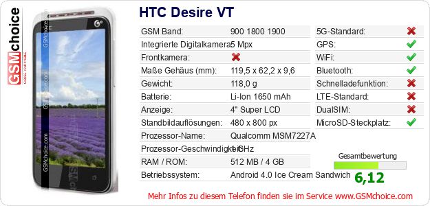 Hast du eigene Webseite? Willst du die Informationen über Standarddaten des Handys HTC Desire VT irgendwo veröffentlichen? Das ist sehr einfach. Du kannst das Bild herunterladen oder kopieren und auf der Webseite folgenden Code hinzufügen:Das Einfügen von diesem Code verursacht das Anzeigen von dem folgenden Bild: