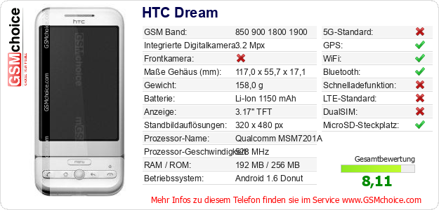 Hast du eigene Webseite? Willst du die Informationen über Standarddaten des Handys HTC Dream irgendwo veröffentlichen? Das ist sehr einfach. Du kannst das Bild herunterladen oder kopieren und auf der Webseite folgenden Code hinzufügen:Das Einfügen von diesem Code verursacht das Anzeigen von dem folgenden Bild: