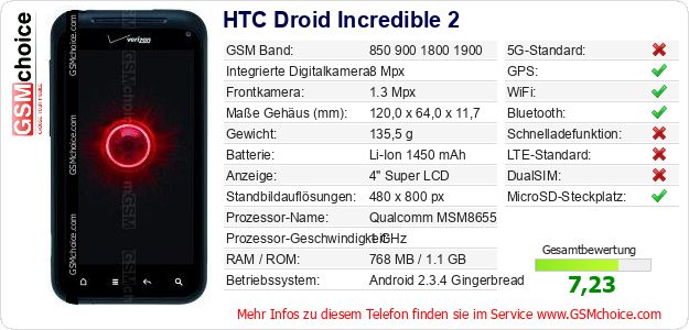Hast du eigene Webseite? Willst du die Informationen über Standarddaten des Handys HTC Droid Incredible 2 irgendwo veröffentlichen? Das ist sehr einfach. Du kannst das Bild herunterladen oder kopieren und auf der Webseite folgenden Code hinzufügen:Das Einfügen von diesem Code verursacht das Anzeigen von dem folgenden Bild: