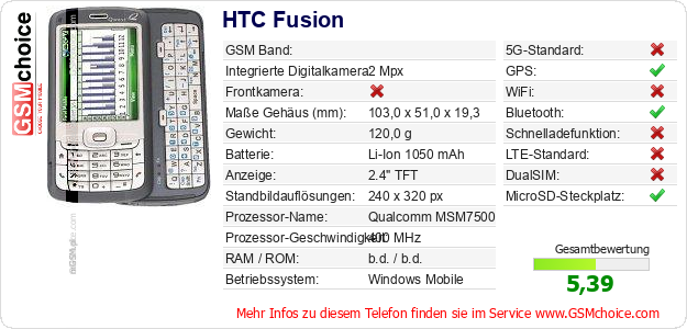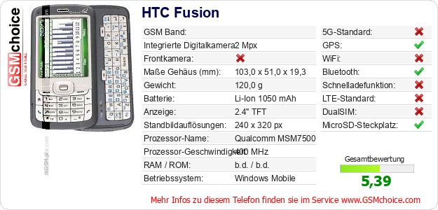 Hast du eigene Webseite? Willst du die Informationen über Standarddaten des Handys HTC Fusion irgendwo veröffentlichen? Das ist sehr einfach. Du kannst das Bild herunterladen oder kopieren und auf der Webseite folgenden Code hinzufügen:Das Einfügen von diesem Code verursacht das Anzeigen von dem folgenden Bild: