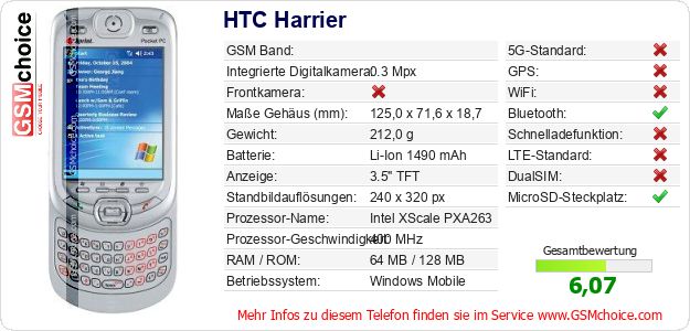 Hast du eigene Webseite? Willst du die Informationen über Standarddaten des Handys HTC Harrier irgendwo veröffentlichen? Das ist sehr einfach. Du kannst das Bild herunterladen oder kopieren und auf der Webseite folgenden Code hinzufügen:Das Einfügen von diesem Code verursacht das Anzeigen von dem folgenden Bild: