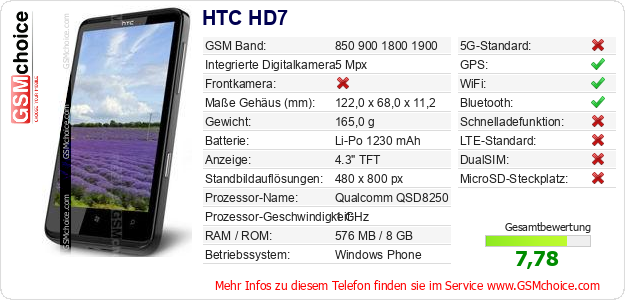 Hast du eigene Webseite? Willst du die Informationen über Standarddaten des Handys HTC HD7 irgendwo veröffentlichen? Das ist sehr einfach. Du kannst das Bild herunterladen oder kopieren und auf der Webseite folgenden Code hinzufügen:Das Einfügen von diesem Code verursacht das Anzeigen von dem folgenden Bild: