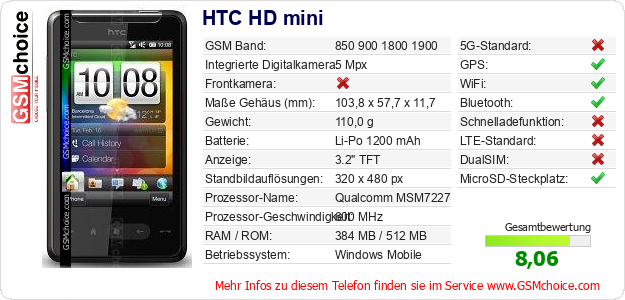 Hast du eigene Webseite? Willst du die Informationen über Standarddaten des Handys HTC HD mini irgendwo veröffentlichen? Das ist sehr einfach. Du kannst das Bild herunterladen oder kopieren und auf der Webseite folgenden Code hinzufügen:Das Einfügen von diesem Code verursacht das Anzeigen von dem folgenden Bild: