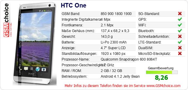 Hast du eigene Webseite? Willst du die Informationen über Standarddaten des Handys HTC One irgendwo veröffentlichen? Das ist sehr einfach. Du kannst das Bild herunterladen oder kopieren und auf der Webseite folgenden Code hinzufügen:Das Einfügen von diesem Code verursacht das Anzeigen von dem folgenden Bild: