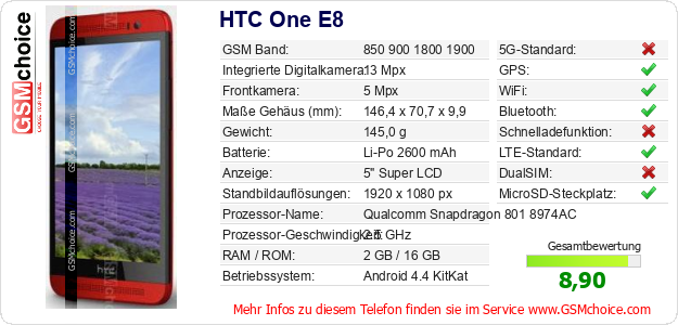 Hast du eigene Webseite? Willst du die Informationen über Standarddaten des Handys HTC One E8 irgendwo veröffentlichen? Das ist sehr einfach. Du kannst das Bild herunterladen oder kopieren und auf der Webseite folgenden Code hinzufügen:Das Einfügen von diesem Code verursacht das Anzeigen von dem folgenden Bild: