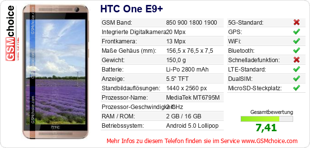 Hast du eigene Webseite? Willst du die Informationen über Standarddaten des Handys HTC One E9+ irgendwo veröffentlichen? Das ist sehr einfach. Du kannst das Bild herunterladen oder kopieren und auf der Webseite folgenden Code hinzufügen:Das Einfügen von diesem Code verursacht das Anzeigen von dem folgenden Bild: