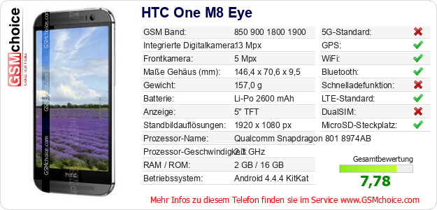 Hast du eigene Webseite? Willst du die Informationen über Standarddaten des Handys HTC One M8 Eye irgendwo veröffentlichen? Das ist sehr einfach. Du kannst das Bild herunterladen oder kopieren und auf der Webseite folgenden Code hinzufügen:Das Einfügen von diesem Code verursacht das Anzeigen von dem folgenden Bild: