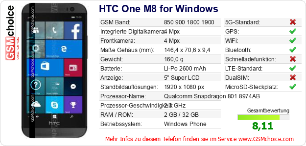 Hast du eigene Webseite? Willst du die Informationen über Standarddaten des Handys HTC One M8 for Windows irgendwo veröffentlichen? Das ist sehr einfach. Du kannst das Bild herunterladen oder kopieren und auf der Webseite folgenden Code hinzufügen:Das Einfügen von diesem Code verursacht das Anzeigen von dem folgenden Bild: