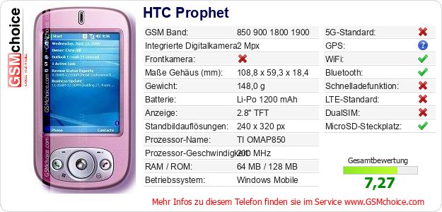 Hast du eigene Webseite? Willst du die Informationen über Standarddaten des Handys HTC Prophet irgendwo veröffentlichen? Das ist sehr einfach. Du kannst das Bild herunterladen oder kopieren und auf der Webseite folgenden Code hinzufügen:Das Einfügen von diesem Code verursacht das Anzeigen von dem folgenden Bild: