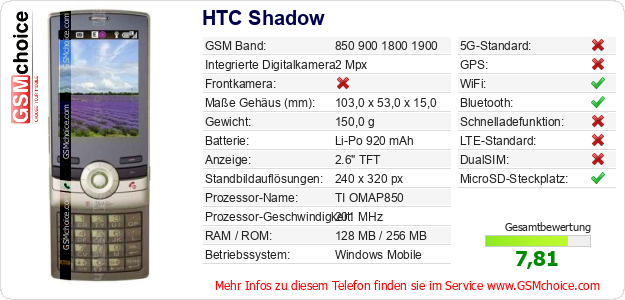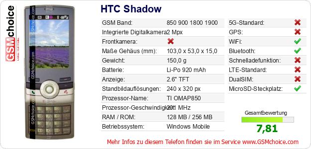 Hast du eigene Webseite? Willst du die Informationen über Standarddaten des Handys HTC Shadow irgendwo veröffentlichen? Das ist sehr einfach. Du kannst das Bild herunterladen oder kopieren und auf der Webseite folgenden Code hinzufügen:Das Einfügen von diesem Code verursacht das Anzeigen von dem folgenden Bild: