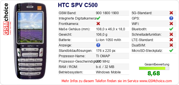 Hast du eigene Webseite? Willst du die Informationen über Standarddaten des Handys HTC SPV C500 irgendwo veröffentlichen? Das ist sehr einfach. Du kannst das Bild herunterladen oder kopieren und auf der Webseite folgenden Code hinzufügen:Das Einfügen von diesem Code verursacht das Anzeigen von dem folgenden Bild: