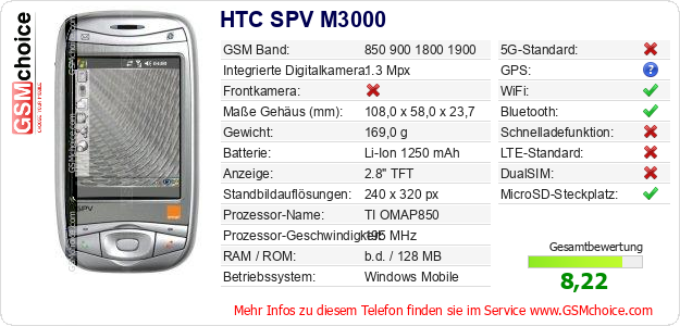 Hast du eigene Webseite? Willst du die Informationen über Standarddaten des Handys HTC SPV M3000 irgendwo veröffentlichen? Das ist sehr einfach. Du kannst das Bild herunterladen oder kopieren und auf der Webseite folgenden Code hinzufügen:Das Einfügen von diesem Code verursacht das Anzeigen von dem folgenden Bild: