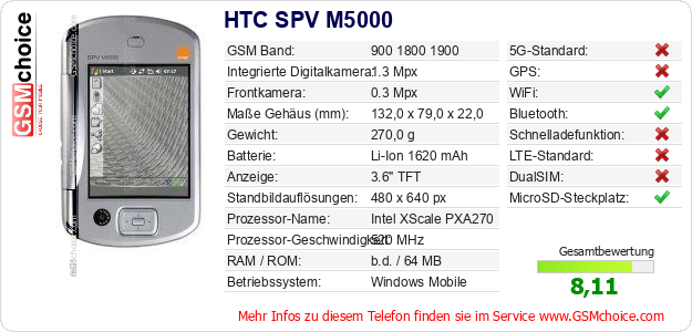 Hast du eigene Webseite? Willst du die Informationen über Standarddaten des Handys HTC SPV M5000 irgendwo veröffentlichen? Das ist sehr einfach. Du kannst das Bild herunterladen oder kopieren und auf der Webseite folgenden Code hinzufügen:Das Einfügen von diesem Code verursacht das Anzeigen von dem folgenden Bild: