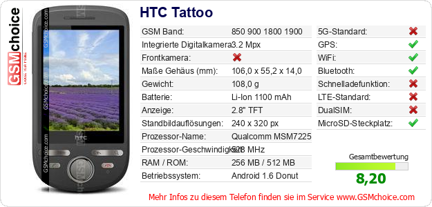 Hast du eigene Webseite? Willst du die Informationen über Standarddaten des Handys HTC Tattoo irgendwo veröffentlichen? Das ist sehr einfach. Du kannst das Bild herunterladen oder kopieren und auf der Webseite folgenden Code hinzufügen:Das Einfügen von diesem Code verursacht das Anzeigen von dem folgenden Bild: