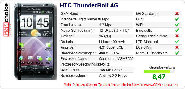 Hast du eigene Webseite? Willst du die Informationen über Standarddaten des Handys HTC ThunderBolt 4G irgendwo veröffentlichen? Das ist sehr einfach. Du kannst das Bild herunterladen oder kopieren und auf der Webseite folgenden Code hinzufügen:Das Einfügen von diesem Code verursacht das Anzeigen von dem folgenden Bild: