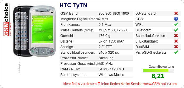 Hast du eigene Webseite? Willst du die Informationen über Standarddaten des Handys HTC TyTN irgendwo veröffentlichen? Das ist sehr einfach. Du kannst das Bild herunterladen oder kopieren und auf der Webseite folgenden Code hinzufügen:Das Einfügen von diesem Code verursacht das Anzeigen von dem folgenden Bild: