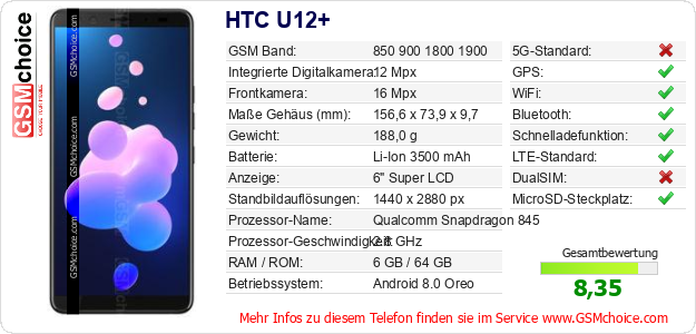 Hast du eigene Webseite? Willst du die Informationen über Standarddaten des Handys HTC U12+ irgendwo veröffentlichen? Das ist sehr einfach. Du kannst das Bild herunterladen oder kopieren und auf der Webseite folgenden Code hinzufügen:Das Einfügen von diesem Code verursacht das Anzeigen von dem folgenden Bild: