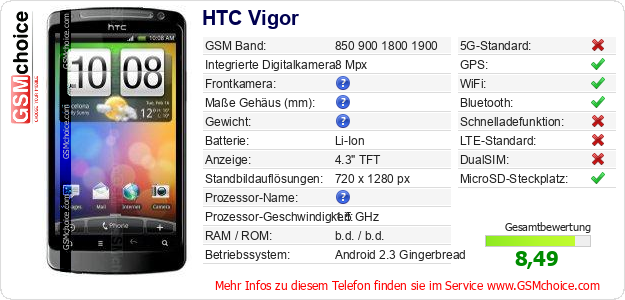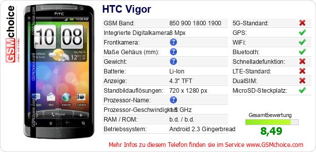 Hast du eigene Webseite? Willst du die Informationen über Standarddaten des Handys HTC Vigor irgendwo veröffentlichen? Das ist sehr einfach. Du kannst das Bild herunterladen oder kopieren und auf der Webseite folgenden Code hinzufügen:Das Einfügen von diesem Code verursacht das Anzeigen von dem folgenden Bild:
