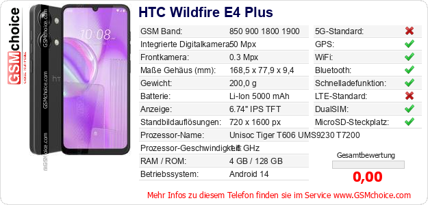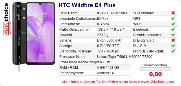 Hast du eigene Webseite? Willst du die Informationen über Standarddaten des Handys HTC Wildfire E4 Plus irgendwo veröffentlichen? Das ist sehr einfach. Du kannst das Bild herunterladen oder kopieren und auf der Webseite folgenden Code hinzufügen:Das Einfügen von diesem Code verursacht das Anzeigen von dem folgenden Bild: