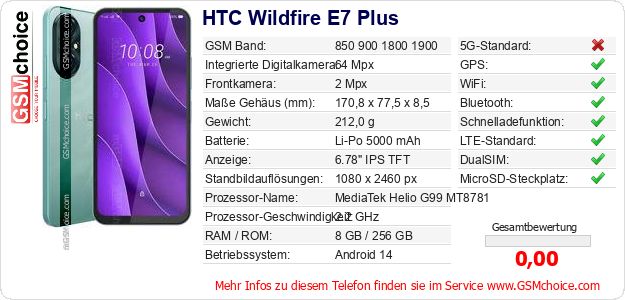 Hast du eigene Webseite? Willst du die Informationen über Standarddaten des Handys HTC Wildfire E7 Plus irgendwo veröffentlichen? Das ist sehr einfach. Du kannst das Bild herunterladen oder kopieren und auf der Webseite folgenden Code hinzufügen:Das Einfügen von diesem Code verursacht das Anzeigen von dem folgenden Bild: