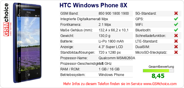 Hast du eigene Webseite? Willst du die Informationen über Standarddaten des Handys HTC Windows Phone 8X irgendwo veröffentlichen? Das ist sehr einfach. Du kannst das Bild herunterladen oder kopieren und auf der Webseite folgenden Code hinzufügen:Das Einfügen von diesem Code verursacht das Anzeigen von dem folgenden Bild: