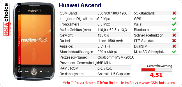 Hast du eigene Webseite? Willst du die Informationen über Standarddaten des Handys Huawei Ascend irgendwo veröffentlichen? Das ist sehr einfach. Du kannst das Bild herunterladen oder kopieren und auf der Webseite folgenden Code hinzufügen:Das Einfügen von diesem Code verursacht das Anzeigen von dem folgenden Bild: