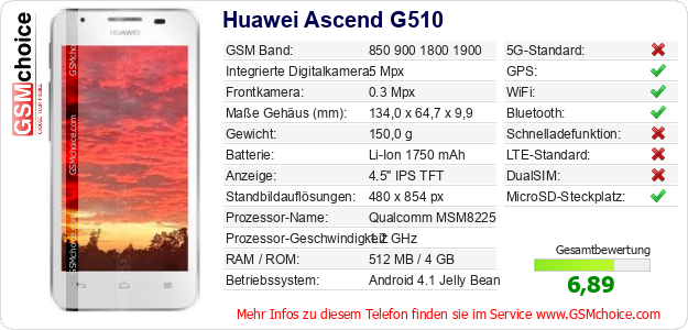 Hast du eigene Webseite? Willst du die Informationen über Standarddaten des Handys Huawei Ascend G510 irgendwo veröffentlichen? Das ist sehr einfach. Du kannst das Bild herunterladen oder kopieren und auf der Webseite folgenden Code hinzufügen:Das Einfügen von diesem Code verursacht das Anzeigen von dem folgenden Bild:
