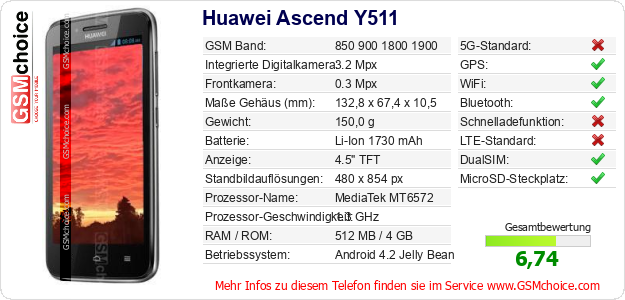 Hast du eigene Webseite? Willst du die Informationen über Standarddaten des Handys Huawei Ascend Y511 irgendwo veröffentlichen? Das ist sehr einfach. Du kannst das Bild herunterladen oder kopieren und auf der Webseite folgenden Code hinzufügen:Das Einfügen von diesem Code verursacht das Anzeigen von dem folgenden Bild: