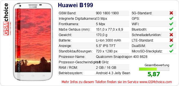 Hast du eigene Webseite? Willst du die Informationen über Standarddaten des Handys Huawei B199 irgendwo veröffentlichen? Das ist sehr einfach. Du kannst das Bild herunterladen oder kopieren und auf der Webseite folgenden Code hinzufügen:Das Einfügen von diesem Code verursacht das Anzeigen von dem folgenden Bild: