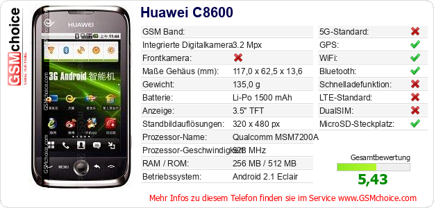 Hast du eigene Webseite? Willst du die Informationen über Standarddaten des Handys Huawei C8600 irgendwo veröffentlichen? Das ist sehr einfach. Du kannst das Bild herunterladen oder kopieren und auf der Webseite folgenden Code hinzufügen:Das Einfügen von diesem Code verursacht das Anzeigen von dem folgenden Bild: