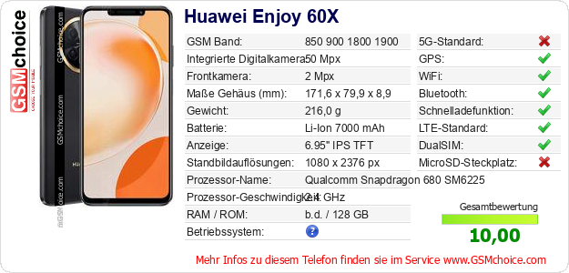 Hast du eigene Webseite? Willst du die Informationen über Standarddaten des Handys Huawei Enjoy 60X irgendwo veröffentlichen? Das ist sehr einfach. Du kannst das Bild herunterladen oder kopieren und auf der Webseite folgenden Code hinzufügen:Das Einfügen von diesem Code verursacht das Anzeigen von dem folgenden Bild: