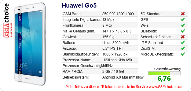 Hast du eigene Webseite? Willst du die Informationen über Standarddaten des Handys Huawei Go5 irgendwo veröffentlichen? Das ist sehr einfach. Du kannst das Bild herunterladen oder kopieren und auf der Webseite folgenden Code hinzufügen:Das Einfügen von diesem Code verursacht das Anzeigen von dem folgenden Bild: