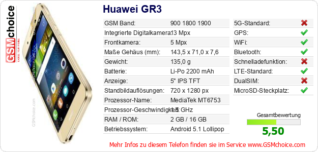 Hast du eigene Webseite? Willst du die Informationen über Standarddaten des Handys Huawei GR3 irgendwo veröffentlichen? Das ist sehr einfach. Du kannst das Bild herunterladen oder kopieren und auf der Webseite folgenden Code hinzufügen:Das Einfügen von diesem Code verursacht das Anzeigen von dem folgenden Bild: