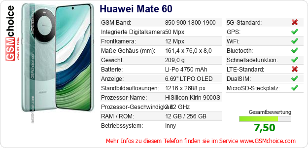 Hast du eigene Webseite? Willst du die Informationen über Standarddaten des Handys Huawei Mate 60 irgendwo veröffentlichen? Das ist sehr einfach. Du kannst das Bild herunterladen oder kopieren und auf der Webseite folgenden Code hinzufügen:Das Einfügen von diesem Code verursacht das Anzeigen von dem folgenden Bild: