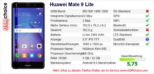 Hast du eigene Webseite? Willst du die Informationen über Standarddaten des Handys Huawei Mate 9 Lite irgendwo veröffentlichen? Das ist sehr einfach. Du kannst das Bild herunterladen oder kopieren und auf der Webseite folgenden Code hinzufügen:Das Einfügen von diesem Code verursacht das Anzeigen von dem folgenden Bild: