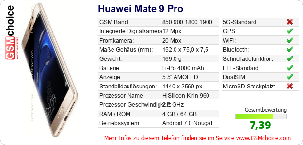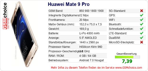 Hast du eigene Webseite? Willst du die Informationen über Standarddaten des Handys Huawei Mate 9 Pro irgendwo veröffentlichen? Das ist sehr einfach. Du kannst das Bild herunterladen oder kopieren und auf der Webseite folgenden Code hinzufügen:Das Einfügen von diesem Code verursacht das Anzeigen von dem folgenden Bild:
