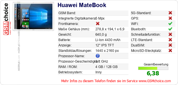 Hast du eigene Webseite? Willst du die Informationen über Standarddaten des Handys Huawei MateBook irgendwo veröffentlichen? Das ist sehr einfach. Du kannst das Bild herunterladen oder kopieren und auf der Webseite folgenden Code hinzufügen:Das Einfügen von diesem Code verursacht das Anzeigen von dem folgenden Bild: