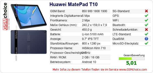 Hast du eigene Webseite? Willst du die Informationen über Standarddaten des Handys Huawei MatePad T10 irgendwo veröffentlichen? Das ist sehr einfach. Du kannst das Bild herunterladen oder kopieren und auf der Webseite folgenden Code hinzufügen:Das Einfügen von diesem Code verursacht das Anzeigen von dem folgenden Bild: