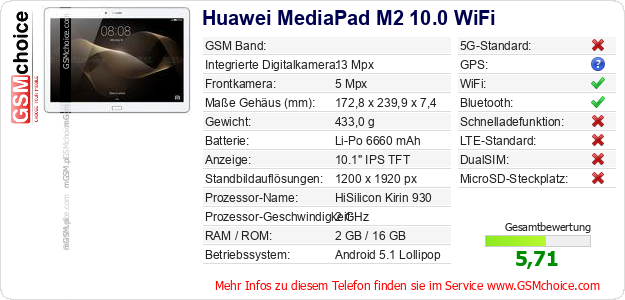 Hast du eigene Webseite? Willst du die Informationen über Standarddaten des Handys Huawei MediaPad M2 10.0 WiFi irgendwo veröffentlichen? Das ist sehr einfach. Du kannst das Bild herunterladen oder kopieren und auf der Webseite folgenden Code hinzufügen:Das Einfügen von diesem Code verursacht das Anzeigen von dem folgenden Bild: