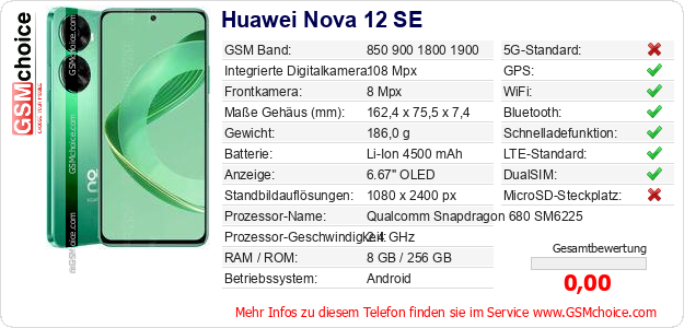 Hast du eigene Webseite? Willst du die Informationen über Standarddaten des Handys Huawei Nova 12 SE irgendwo veröffentlichen? Das ist sehr einfach. Du kannst das Bild herunterladen oder kopieren und auf der Webseite folgenden Code hinzufügen:Das Einfügen von diesem Code verursacht das Anzeigen von dem folgenden Bild: