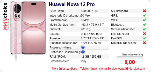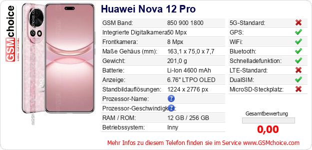 Hast du eigene Webseite? Willst du die Informationen über Standarddaten des Handys Huawei Nova 12 Pro irgendwo veröffentlichen? Das ist sehr einfach. Du kannst das Bild herunterladen oder kopieren und auf der Webseite folgenden Code hinzufügen:Das Einfügen von diesem Code verursacht das Anzeigen von dem folgenden Bild: