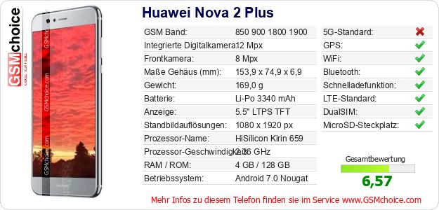 Hast du eigene Webseite? Willst du die Informationen über Standarddaten des Handys Huawei Nova 2 Plus irgendwo veröffentlichen? Das ist sehr einfach. Du kannst das Bild herunterladen oder kopieren und auf der Webseite folgenden Code hinzufügen:Das Einfügen von diesem Code verursacht das Anzeigen von dem folgenden Bild: