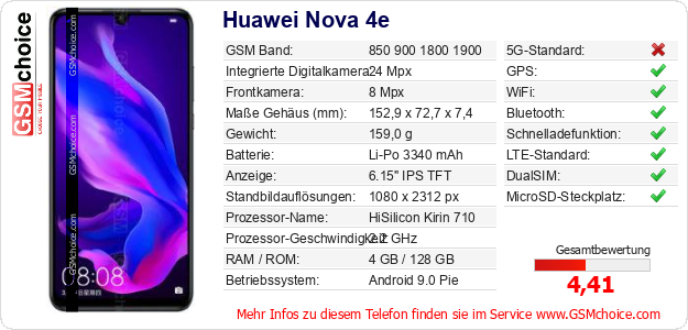 Hast du eigene Webseite? Willst du die Informationen über Standarddaten des Handys Huawei Nova 4e irgendwo veröffentlichen? Das ist sehr einfach. Du kannst das Bild herunterladen oder kopieren und auf der Webseite folgenden Code hinzufügen:Das Einfügen von diesem Code verursacht das Anzeigen von dem folgenden Bild:
