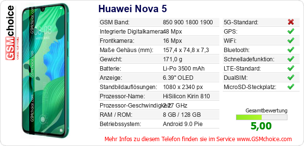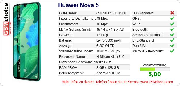 Hast du eigene Webseite? Willst du die Informationen über Standarddaten des Handys Huawei Nova 5 irgendwo veröffentlichen? Das ist sehr einfach. Du kannst das Bild herunterladen oder kopieren und auf der Webseite folgenden Code hinzufügen:Das Einfügen von diesem Code verursacht das Anzeigen von dem folgenden Bild: