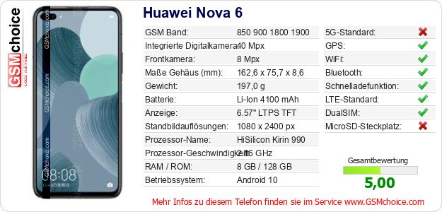 Hast du eigene Webseite? Willst du die Informationen über Standarddaten des Handys Huawei Nova 6 irgendwo veröffentlichen? Das ist sehr einfach. Du kannst das Bild herunterladen oder kopieren und auf der Webseite folgenden Code hinzufügen:Das Einfügen von diesem Code verursacht das Anzeigen von dem folgenden Bild: