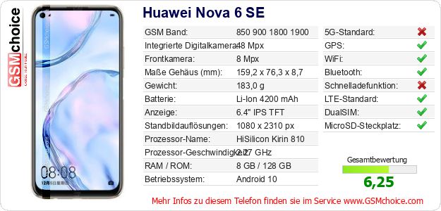 Hast du eigene Webseite? Willst du die Informationen über Standarddaten des Handys Huawei Nova 6 SE irgendwo veröffentlichen? Das ist sehr einfach. Du kannst das Bild herunterladen oder kopieren und auf der Webseite folgenden Code hinzufügen:Das Einfügen von diesem Code verursacht das Anzeigen von dem folgenden Bild: