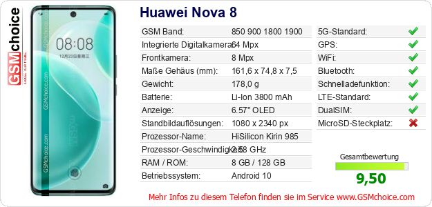 Hast du eigene Webseite? Willst du die Informationen über Standarddaten des Handys Huawei Nova 8 irgendwo veröffentlichen? Das ist sehr einfach. Du kannst das Bild herunterladen oder kopieren und auf der Webseite folgenden Code hinzufügen:Das Einfügen von diesem Code verursacht das Anzeigen von dem folgenden Bild: