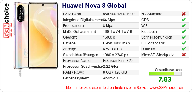 Hast du eigene Webseite? Willst du die Informationen über Standarddaten des Handys Huawei Nova 8 Global irgendwo veröffentlichen? Das ist sehr einfach. Du kannst das Bild herunterladen oder kopieren und auf der Webseite folgenden Code hinzufügen:Das Einfügen von diesem Code verursacht das Anzeigen von dem folgenden Bild: